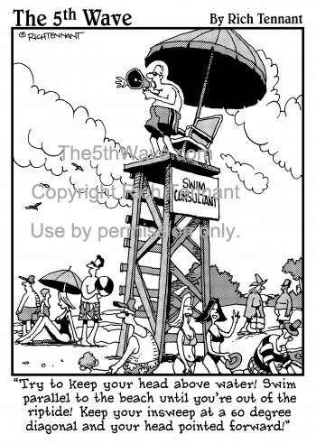 (Swim Consultant) "Try to keep your head above water! Swim parallel to the beach until you're out of the riptide! Keep your insweep at a 60 degree diagonal and your head pointed forward!"
