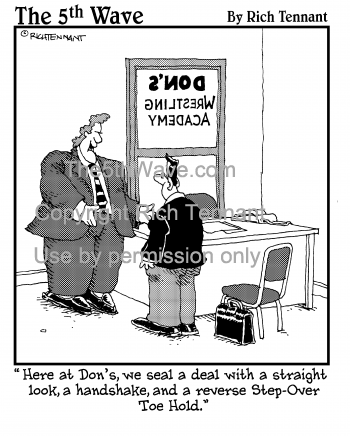 "Here at Don's, we seal a deal with a straight look, a handshake, and a reverse Step-Over Toe Hold."