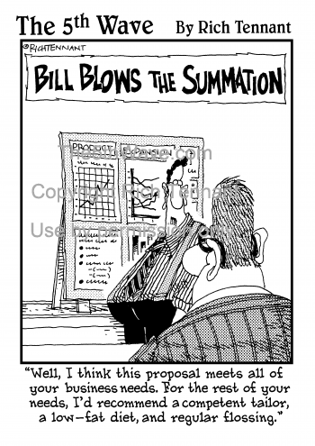 (Bill Blows the Summation) "Well, I think this proposal meets all of your business needs. For the rest of your needs, I'd recommend a competent tailor, a low fat diet and regular flossing."