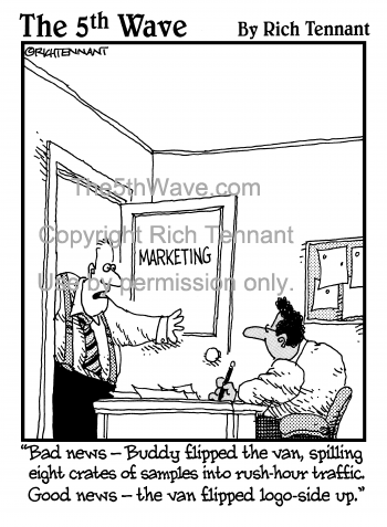 "Bad news - Buddy flipped the van spilling eight crates of samples into rush-hour traffic. Good news - the van flipped logo-side up."