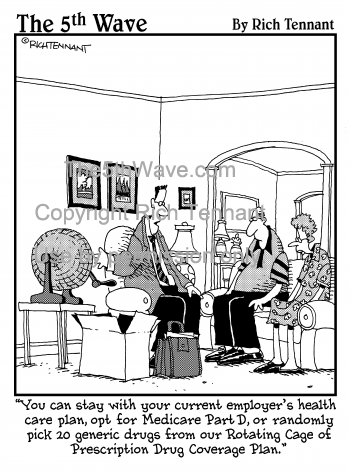 "You can stay with your current employer's health care plan, opt for Medical Part D, or randomly pick 20 generic drugs from our Rotating Cage of Prescription Drug Coverage Plan."