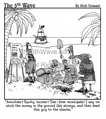 "Annuities? Equity Income? Tax-free Municipals? I say we stick the money in the ground like always, and then feed this guy to the sharks."