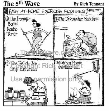 (Easy At Home Exercise Routines: The ironing board Nordic Toner, The dishwasher back row, The relish jar grip enhancer, Kitchen phone overhead pull.)