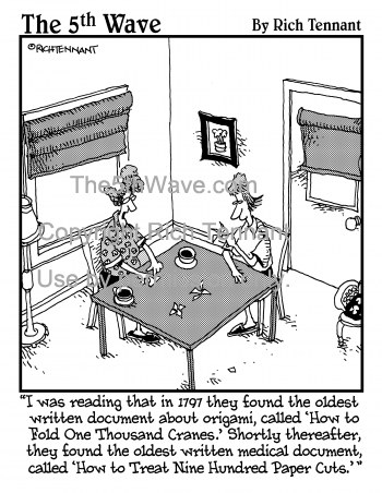 "I was reading that in 1797 they found the oldest written document about origami ,called 'How to Fold One Thousand Cranes.' Shortly thereafter, they found the oldest written medical document, called 'How to Treat Nine Hundred Paper Cuts.'"