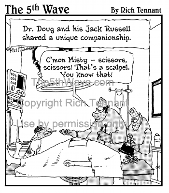 (Dr. Doug And His Jack Russell Shared A Unique Companionship.) "C'mon Misty - scissors, scissors! That's a scalpel. You know that!"