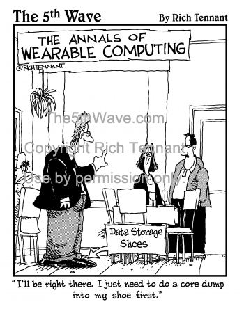 (The Annals of Wearable Computing - Data Storage Shoes) " I'll be right there. I just need to do a core dump into my shoe first."