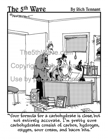 "Your formula for a carbohydrate is close, but not entirely accurate. I'm pretty sure carbohydrates consist of carbon, hydrogen, oxygen, sour cream and bacon bits."