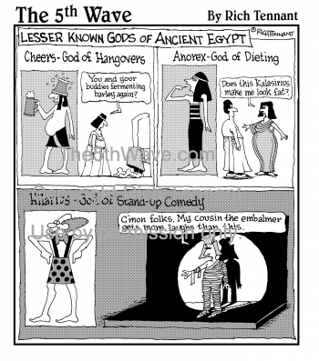 (Lesser known gods of ancient Egypt - Cheers - God of Hangovers - You and your buddies fermenting barley again? - Anorex - God of Dieting - Does this Kalasirius make me look fat? - Hilarius - God of Stand-Up Comedy - C'mon folks. My cousin the embalmer gets more laughs than this.)