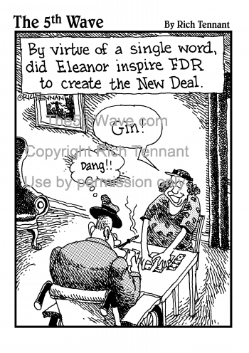 (By virtue of a single word, did Eleanor inspire FDR to create the New Deal.) "Gin!"