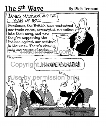 (James Madison and the War of 1812) "Gentlemen, the British have restrained our trade routes, conscripted our sailors into their navy, and now they're supporting the Indians against our settlers in the west. There's clearly only one course of action... Invade Canada!"