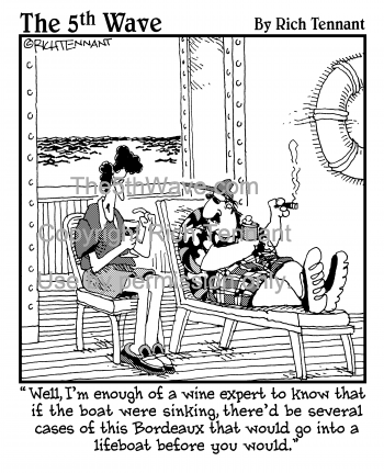 "Well, I'm enough of a wine expert to know that if the boat were sinking, there'd be several cases of this Bordeaux that would go into a lifeboat before you would."