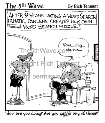 (After 9 years of dating a word search fanatic, Darlene creates her own word search puzzle) "How are you doing? Are you getting' any of these?"