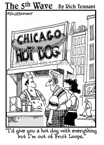 (Chicago Hot Dog) "I'd give you a hot dog with everything but I'm out of Fruit Loops."