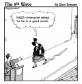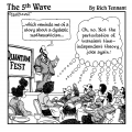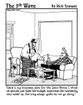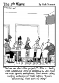 "Before we start this project, I'd like to clarify what metaphors we'll be speaking in. Last time we used sports metaphors. How about using cooking metaphors? 'Half baked,' burnt,' 'simmering,' that sort of thing?" |  "My project plan has changed a little this year." (Get Rescued. Build Golf Resort.) |  "Don't worry, Mrs. Morse. As soon as the plumber's done patching the roof I'll have him call the electrician to finish wallpapering the dining room." |