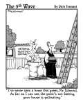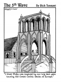 "Neither one of us wanted a silo on the new master suite, but things like this can happen when you don't clean the coffee rings off your building plans." |  "What makes you think your foundation is sinking? Well, for one thing, we're standing on the third floor balcony." |  "I bought a software program that should help us monitor and control our spending habits, and while I was there, I picked up a few new games, a couple of screen savers, 4 new mousepads, this nifty pullout keyboard cradle |  "I think Philip was inspired by our trip last year touring the Great Gothic Decks of Europe." |