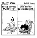 "That one was really close! A little lower and to the left!" |  (The Apocalypse of John) Okay, no one's going to believe this without a snappy title. Let's see, "The Awesome Moment of John, |  "Before I blow my trumpet and deliver a burning ball of fire down upon the earth, how about a few choruses of 'What a friend we have in Jesus'?" |  Tibetan Buddhist Meditation/Stiff Jointed Buddhist Meditation |