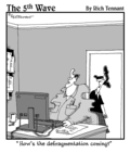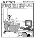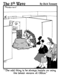 "How's the defragmentation coming?" |  "No that's not the icon for Excel, it's the icon for Excuse, the database of reasons why you haven't learned the other programs in Office." |  "I started running 'what if' scenarios on my spreadsheet, like, 'What if I were sick of this dirtwad job and funneled some of the company's money in to an off-shore account?'" |  (At FEMA, employees often use Excel's custom format function to create formulas for disaster.) |