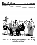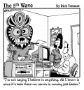 "I build bookshelves and Bernice buys a Kindle." |  "Hang on! I keep entering a search for 'squishy red orb next to the lungs,' and this dumb browser keeps taking me to sites for rubber balls, Silly Putty, and chew toys." |  "I'm not saying I believe in anything. All I know is since it's been there our server is running 50% faster." |  "Okay antidote, antidote, what would an antidote icon look like? You know I still haven't got this desktop the way I'd like it." |