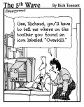 "A centralized security management system sounds fine, but then what would we do with the dogs?" |  (HOW TO INSTALL YOUR SOFTWARE) "Can't I just give you riches or something?" |  "Gee, Richard, you'll have to show me where on the toolbar you found an icon labeled 'Overkill.'" |  "I can't really explain it but every time I animate someone swinging a golf club, a little divot of code comes up missing on the home page." |